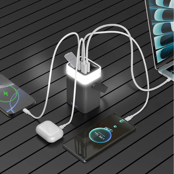 این پاوربانک شامل چراغهای LED دایرهای ۳۶۰ درجه و نورپردازی RGB است که نمای جذابی دارند و با یک دسته داخلی قابل حمل هستند. این پاوربانک دارای خروجی USB-C 65W برای شارژ سریع لپتاپ یا تلفن شما است. از همه بهتر، نمایشگر هوشمند میزان باتری باقیمانده را به شما نشان میدهد، بنابراین هرگز غافلگیر نخواهید شد. سه حالت روشنایی به شما امکان میدهد تا نور را با نیازهای خود متعادل کنید و از این رو به همراه ایدهآلی برای زیبایی و عملکرد تبدیل شوید.